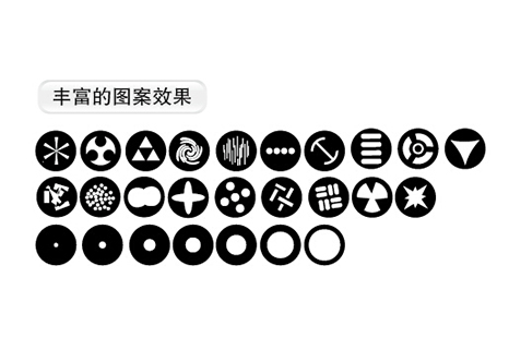 1個旋轉(zhuǎn)圖案盤:7個自轉(zhuǎn)圖案+白光;具有變速抖動效果、雙向變速流動效果;自轉(zhuǎn)圖案片可換。圖案片外形直徑Ф22.5mm,圖案有效直徑Ф9mm